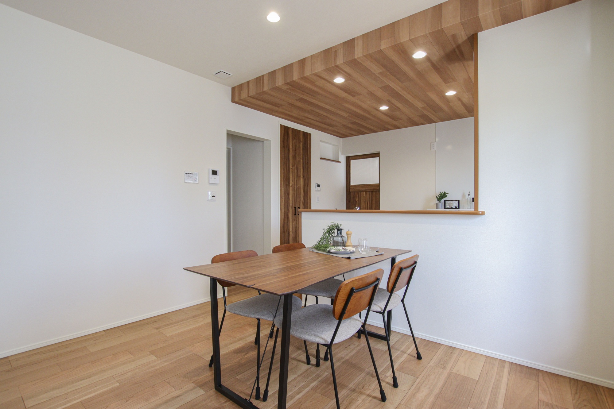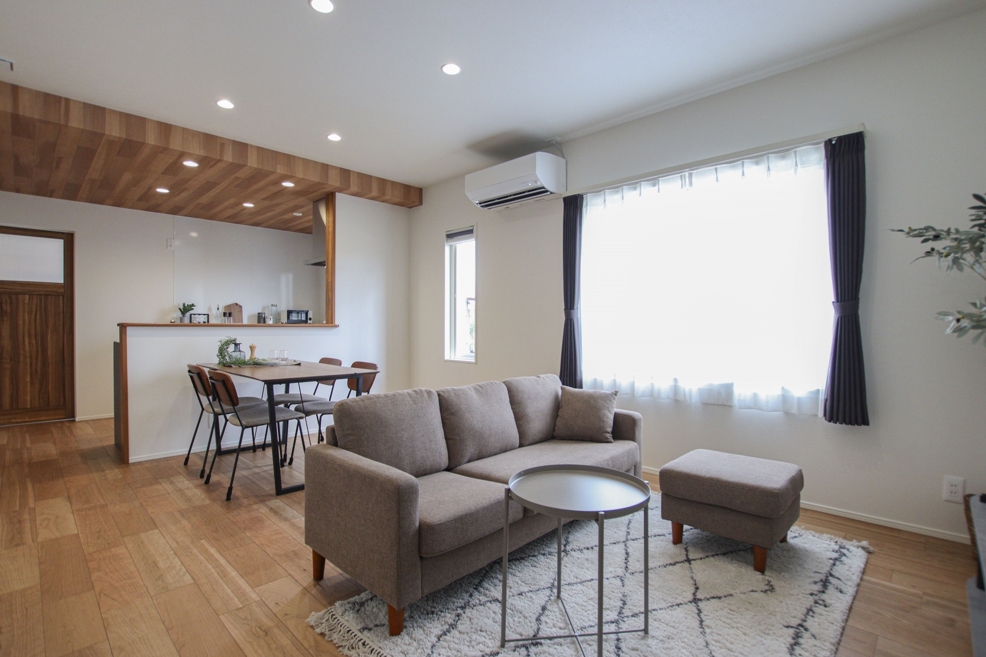 ジャパンディテイストのあたたかみのあるリビング。 キッチン腰壁には、「システム収納」があり お気に入りの小物を飾ったり、書類などを収納することができます