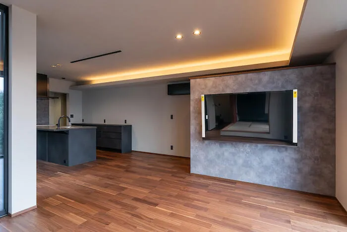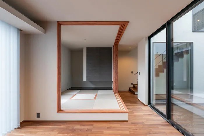 約20帖のLDKは、小上がりのタタミコーナーとつながる空間。 中庭をぐるりと囲み、内と外が心地よく溶け合います。
