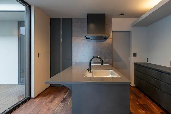 すっきりとしたフラットキッチンで、中庭を眺めながら料理の時間を心地よく。