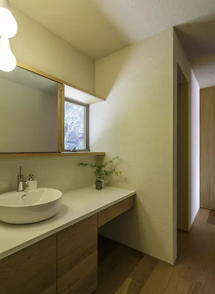 洗面室も木製のカウンターで、温かみのある印象に。 窓から覗く緑も、爽やかな自然の中にいることを感じさせます。