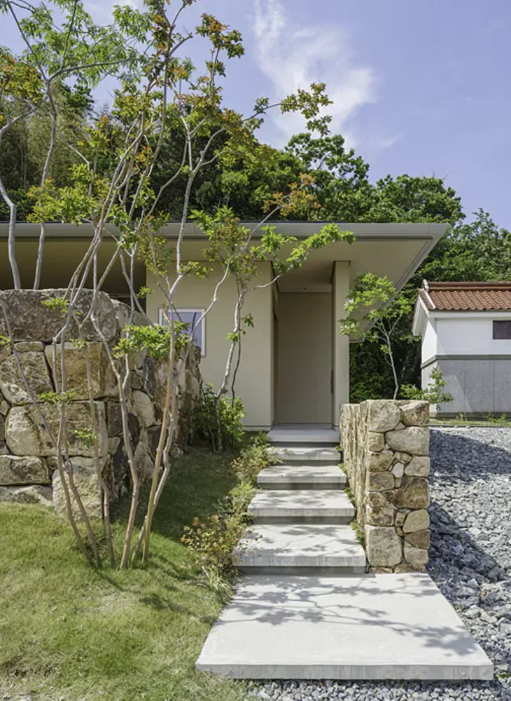 玄関へは石垣の間を縫うようなアプローチを通って。 庭には芝が敷かれ、ご夫婦が自ら選ばれたイロハモミジやサルスベリ、ヤマツツジなどが植えられています。