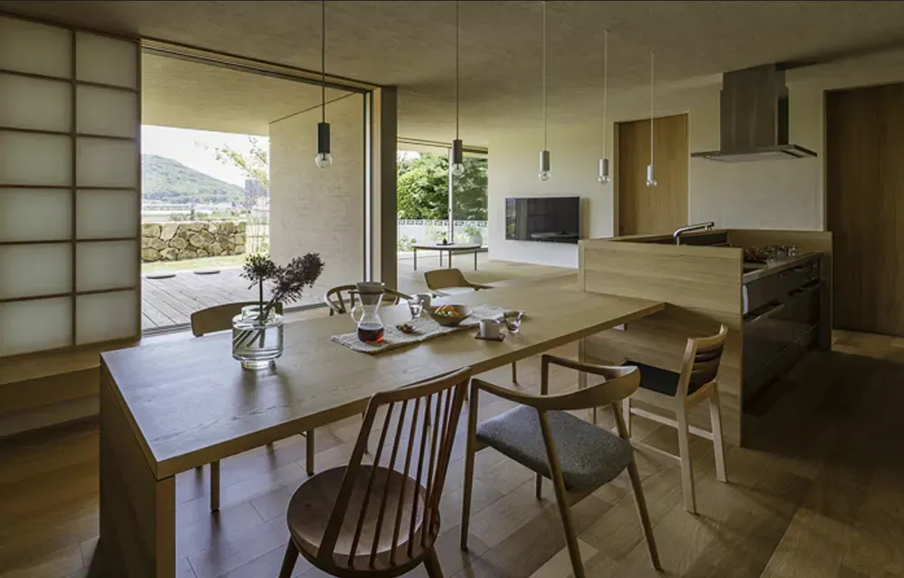 リビングやウッドデッキとは一段低くなったダイニングとキッチン。視線が合うとともに、南の開口部より低くなることで、外との距離を感じ、木のインテリアに包み込まれる安心感が生まれます。