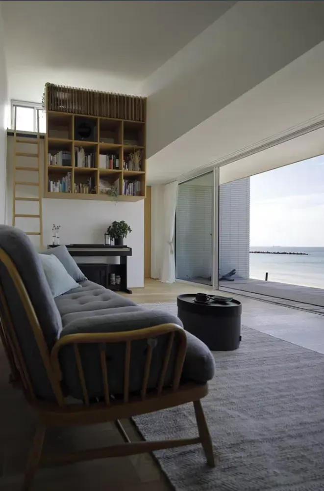 勾配屋根の吹き抜けにロフトを設け、間仕切りを兼ねた本棚を設置し、開放的な空間を演出。 ロフトからも、高い視線で海を一望できる。ゲストルームとしても活用でき、機能性と遊び心を形にした空間。