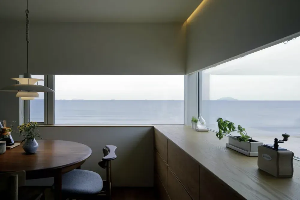ダイニングのコーナー窓。その窓からは、西側の海だけではなく、 順光によって美しい光景を見せる、北側の山も望める。