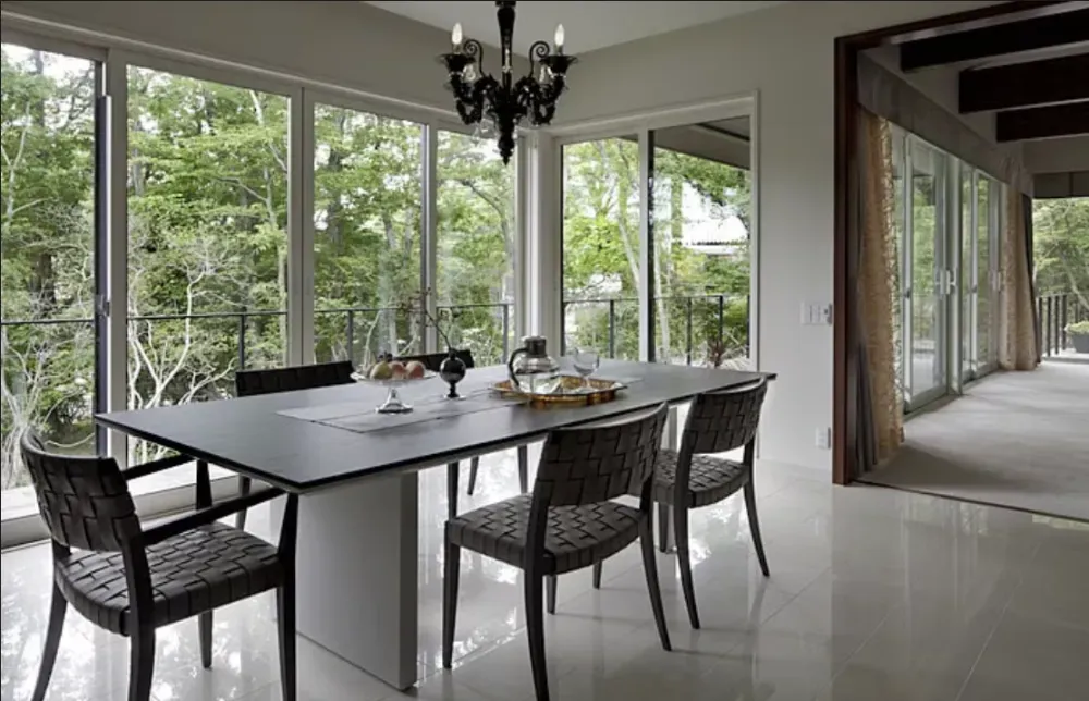 家族の朝食のひとときを、気持ちのいい木漏れ日の下、まるで戸外で楽しむように。ダイニングをいちばん東南側に突き出す配置とし、L字にとられた窓からあふれる緑が飛び込んでくるようなイメージを形にしました。