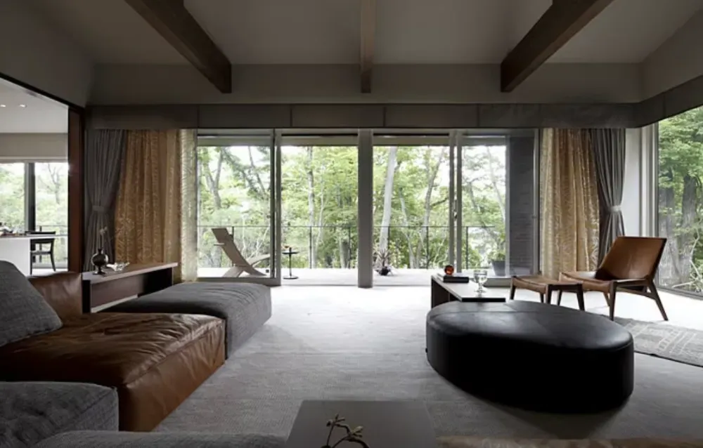 2.5寸の自然な勾配の屋根が落ち着きを演出するリビング。可変性のある家具をチョイスし、時には窓の近くで読書をしたり、時には皆で寄り添って語り合ったりと、家族や訪問客が思い思いの場所で寛げるようにしました。