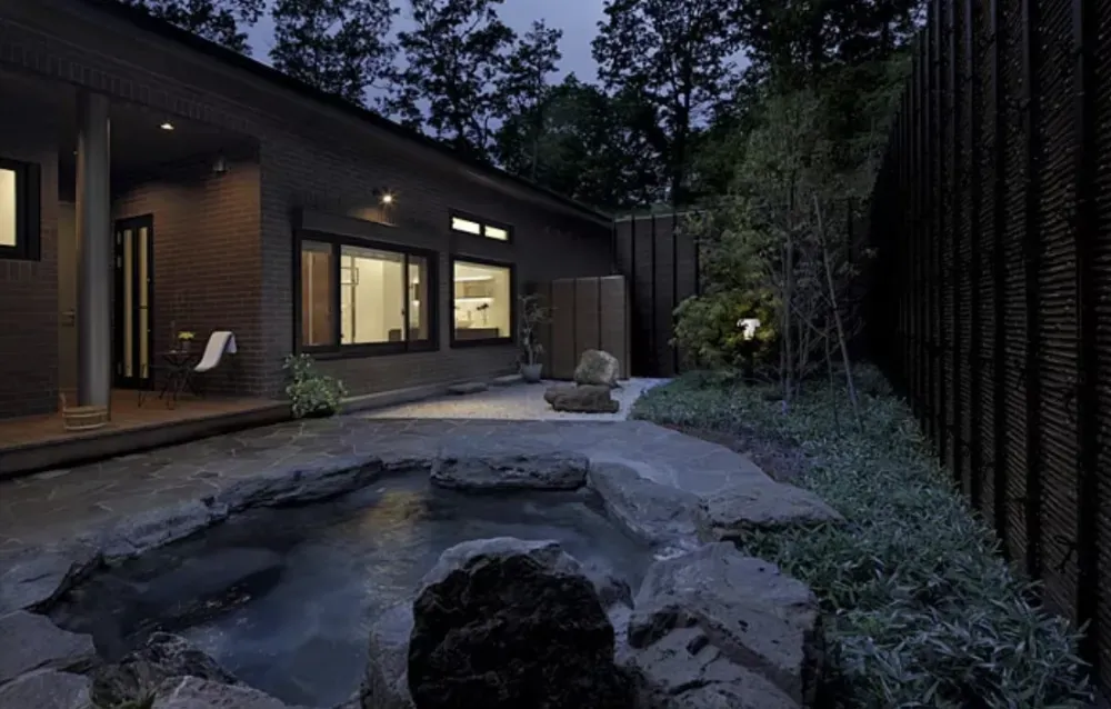 露天風呂は、わざと目隠し用のいろいろな塀をつくったりせずに、建物で自然に囲ってプライバシーを確保。旅館の温泉のように、露天風呂へは浴室から直接出られるように。出入り口にはちょっとした空間を作って、涼めるようにしています。