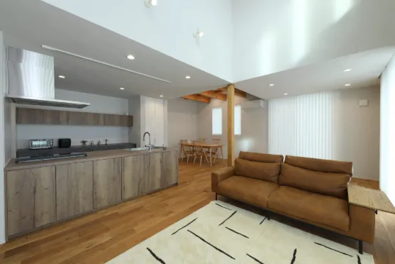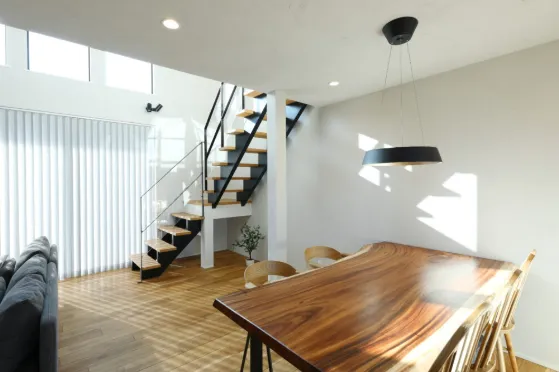 吹抜けと大開口サッシからたっぷりと光が差し込む、明るく開放的なリビング。 アイアン手すりの階段と、高さ2m40cmのハイドアが、ホテルのような上質さを演出します。 外観は、グレー系の外壁と屋根材で統一し、洗練された佇まいに仕上げました。 玄関横にはアウトドア用品を収納できるスペースを確保。また、キッチン横に壁を設けることで、突然の来客時にも生活感が出にくい工夫を施しています。標準仕様の製作建具は、空間に合わせて一つひとつ丁寧に製作。美しく統一感のある、”世界に一つの自然素材の家”が完成いたしました。 2日間限りの開催となります。是非この機会にお越しください。 (画像はイメージです。)