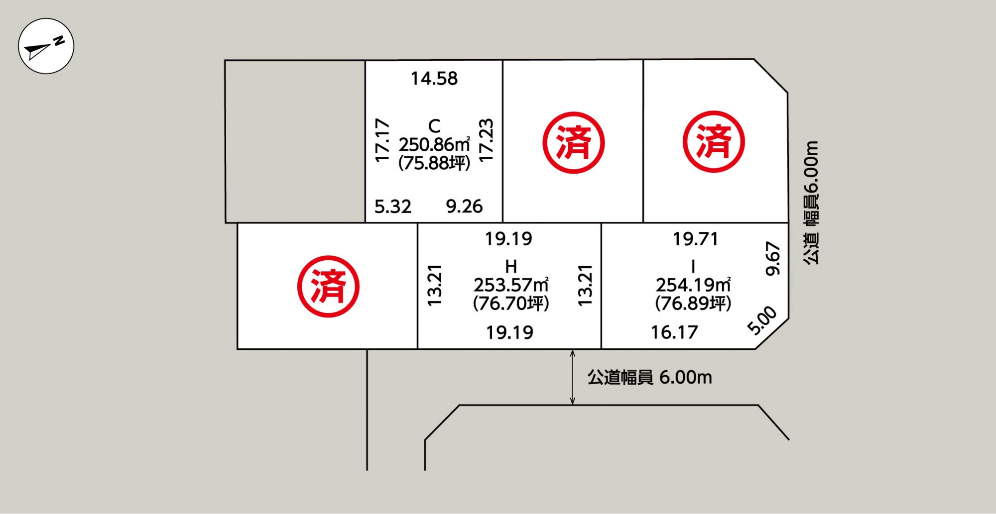 接道/【C】西側幅員6.00mの公道に14.58m接する【H】東側幅員6.00mの公道に19.19m接する【I】北側幅員6.00mの公道に9.67m、東側幅員6.00mの公道に16.17m接する