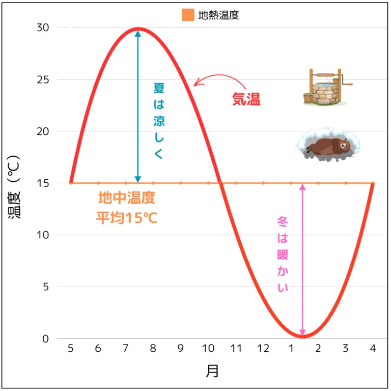 地面の中は、冬でも約15℃前後の温度が保たれているため、その熱を利用することで効率よく暖房することができます。