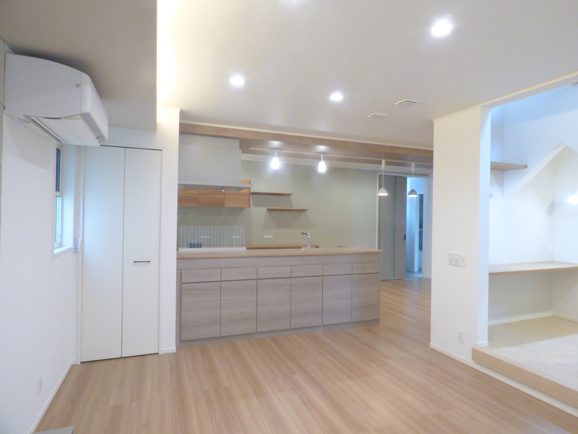 キッチンを家の中心に配置することで、リビングやくつろぎの畳スペース、水回りまで家中見渡せる家事動線になりました。