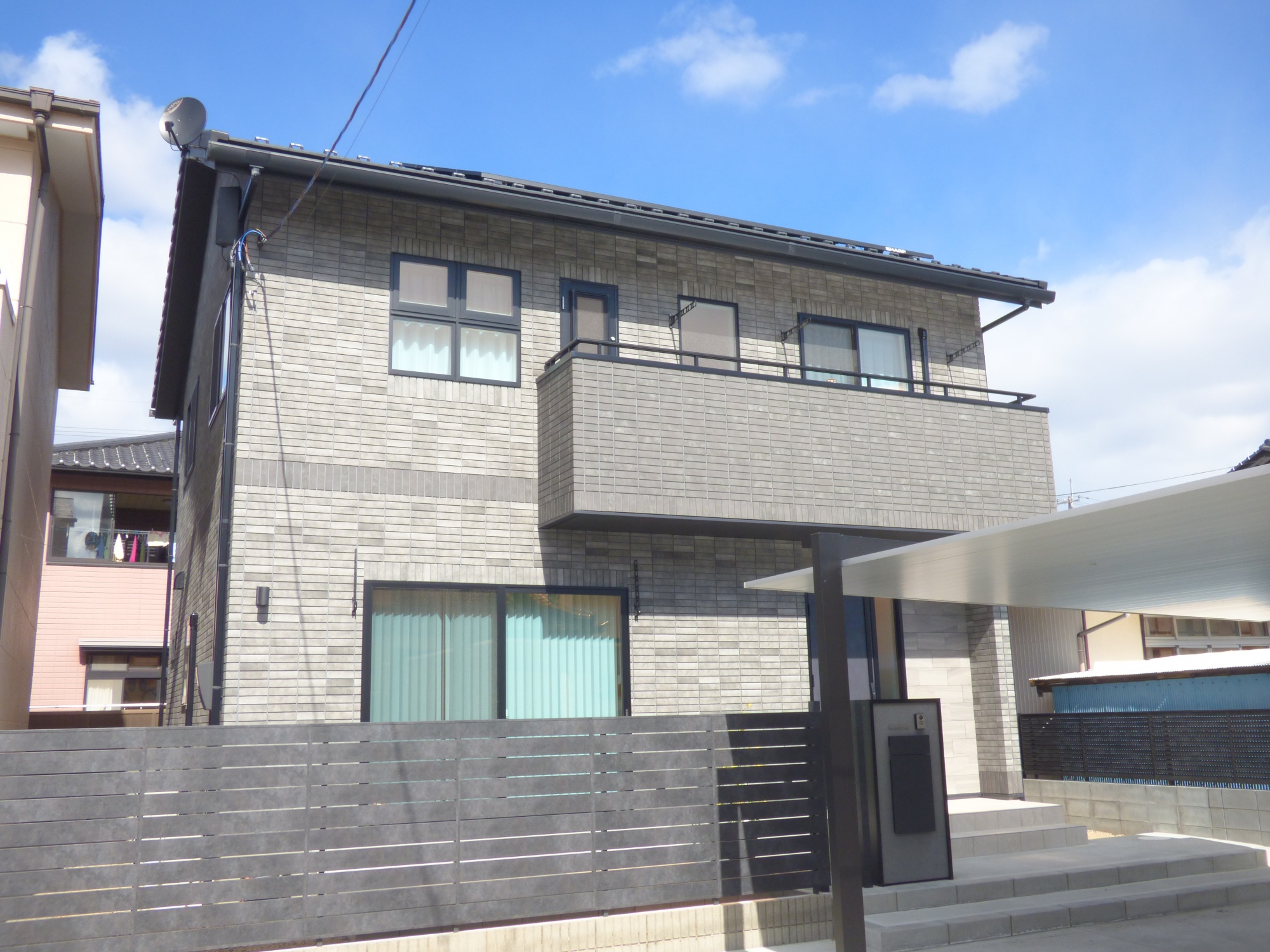 片流れと差し掛け屋根にピュアホワイト色のタイルを前面に施し、住宅街でひと際目を引くおしゃれモダンな佇まい。