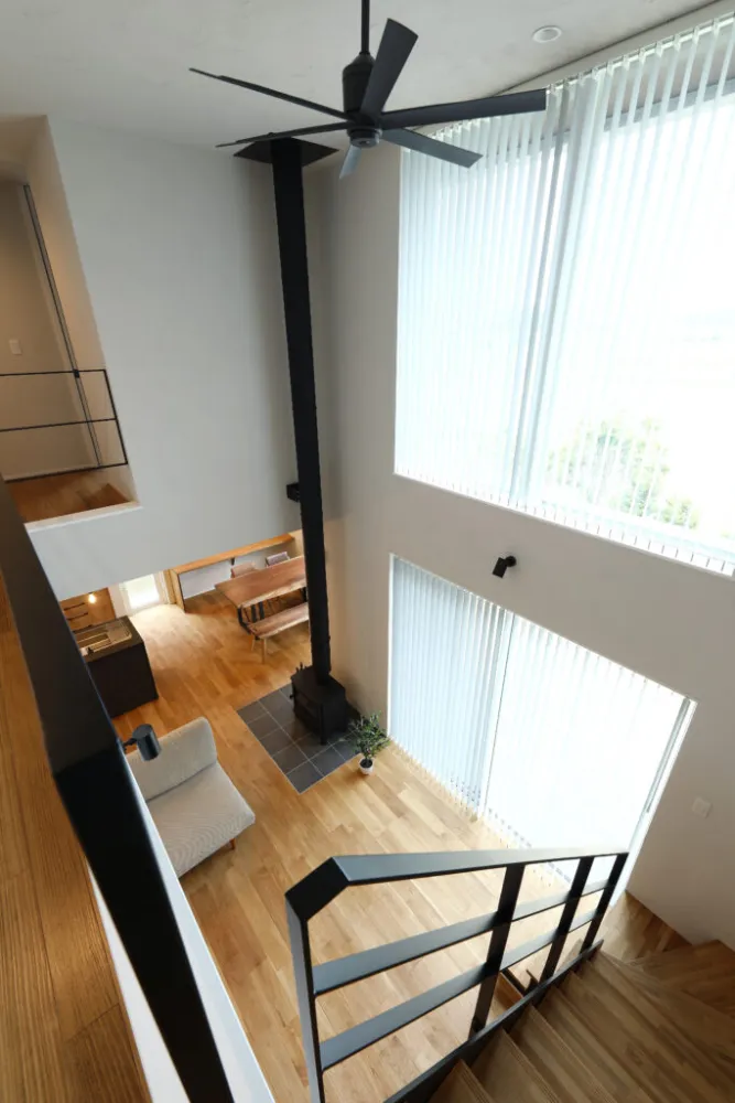 吹抜けから降り注ぐ柔らかな光が、オークの床をやさしく照らす心地よいリビング。薪ストーブやスケルトン階段が空間にリズムを与え、開放感と温もりを両立した上質な時間が流れます。家族が自然と集まる、理想の“くつろぎの中心”です。