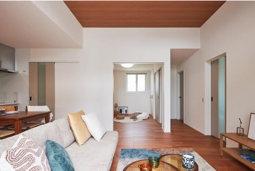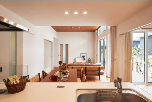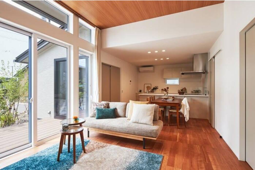 木目の高天井が素敵なLDK空間は約17帖! ウッドデッキとつながる大きな窓が特徴。