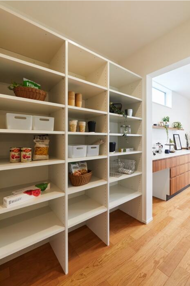 冷蔵庫も収納できて生活感を隠せる大容量のパントリー。