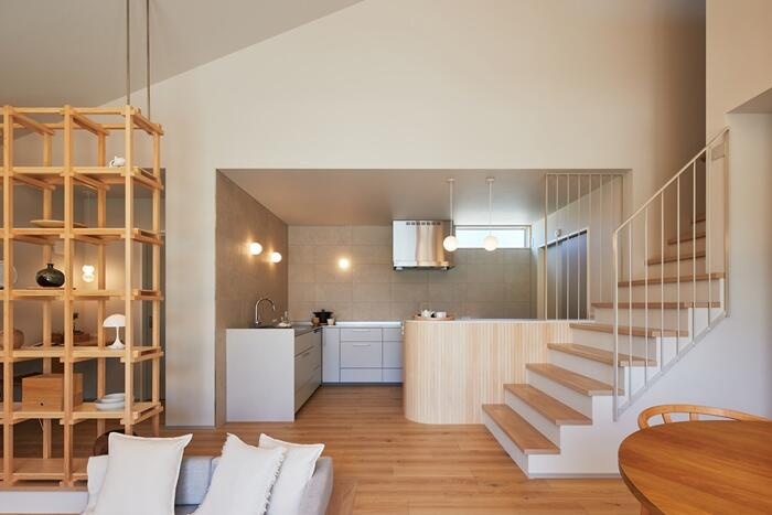 複数人で立てる、広々としたL型キッチン。 手前のカウンターは生活感を出さずに家電を収納できるようにしています。