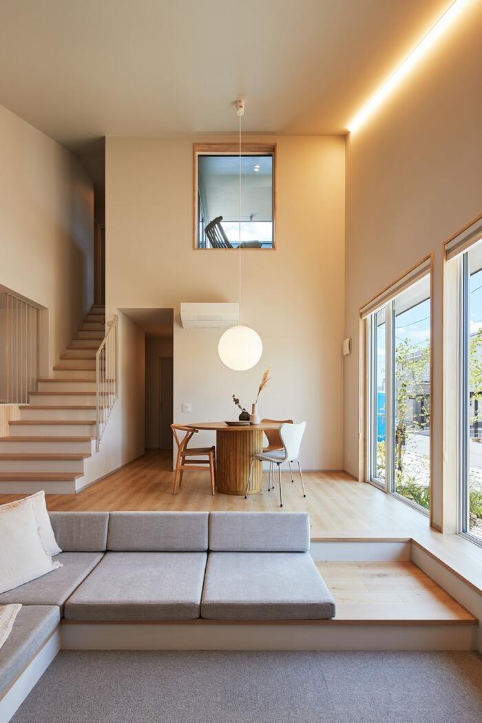 大屋根を活かした開放感たっぷりの勾配天井。 MODIFYの大きなまるいライトとテラスの窓越しに青空が見えます。 家族や友人、何人集まっても居場所があるベンチタイプのダウンフロア。 白い壁はプロジェクターを使い、みんなで映像を見られるようにしました。