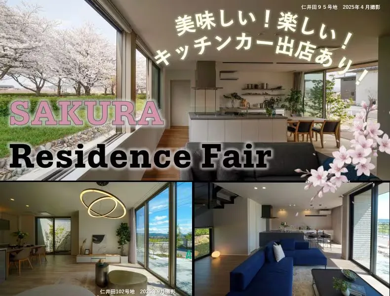 コモンステージ仁井田では、桜並木をバックに外と内がつながる分譲住宅をご見学いただけます。 敷地外には、美味しい!たのしい!キッチンカーも多数出店予定! 分譲住宅内では、宝探しイベントも同時開催♪お宝を見つけて景品をゲットしよう!